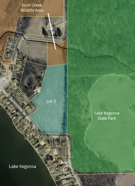 The newly formed Committee to Preserve Lot 3 Sunnyside, Inc. has secured an accepted offer to purchase a parcel located across Sunnyside Street, adjacent to Lake Kegonsa. The property adjoins Lake Kegonsa State Park, the Lower Yahara River Trail, and the Door Creek Wildlife Area. By preserving the land as permanent conservancy, this area can be protected in perpetuity for recreation, wildlife habitat, and clean water for generations to come.